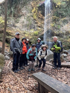 ■地蔵堂から山道に入りまずは金太郎が産湯を使ったとされる風情ある夕日の滝に立ち寄り、落ち葉の下に隠れた大き目の石や根っこに苦戦しながら上り坂を進みます。そしていよいよ金時山の階段地獄です。木製鉄製のいくつもの階段を上り先輩方の「もう少し!」の声を「何度も」聞きながらやっと頂上に到着したら、どこにこんなに登山客がいたのか…という程の混雑ぶり。冷たい風が吹き食事もままならないかと思いきや、その風が富士山を覆っていた雲を吹き飛ばしてくれたかのように美しい姿を見せてくれました。帰りはずっと下りなので本当にアッという間に下山できました。階段は辛かったですが富士山を拝むことが出来て、終わってみれば「楽しかった!」と心から思える山行でした。ご一緒の方々には靴のことなど色々教えていただきありがとうございました。皆さま、お世話になりました。(記 TR)