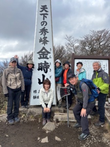 ■金時山は乙女峠または仙石原からの登山が一般的だが、今回は矢倉岳の麓の地蔵堂からスタートし夕日の滝を経由し猪鼻砦跡から山頂まで上り詰めるコースで実施した。他の登山者と行き交うことはほとんどない金時山には珍しいしずかなコースです。沢沿いに渡渉を繰り返し樹林帯を登り、ほぼ順調に猪鼻砦跡に到着したが見える筈の富士山は雲に隠れその姿は見せてくれなかった。当コースの核心部はここからで、約250mの急勾配の標高差を連続する鉄製・木製の階段を頼りに一歩一歩と歩を進めるも息が上がり、2度、3度と休息をとりながらやっとの思いで山頂にたどり着いた。当コースは気軽に楽しめる金時山には不向きなコースではないかと反省の念も覚えました。山頂はかなりの混雑ぶりだったが、食事をとっている間に山頂付近を覆っていた雲も流され見事な富士の山容を見せてくれました。参加頂いた皆さんの無事と満足そうな笑顔に感謝の山行でした。(記 OY)