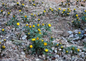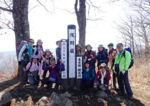 ■予報通り季節外れのとても暖かな1日となりました。暑がりの私は、薄手のシャツ1枚でスタート!その一方、山頂に近づくにつれ北側斜面にはところどころ雪が残っていました。谷側に安全柵も無く危ない箇所もあったりで、リーダーの指示のもと軽アイゼン装着。今回初使用ですが、アイゼン付けていると雪道でも全く安心感が違うんですね。今後のためにも良い経験となりました。山頂近くの展望台からは大岳山や御前山などが見えていたようですが、相変わらず位置関係や山の名前が覚えられません。富士山はというと、「あそこだよ」と教えて頂いた方向をすご〜く目を凝らして、本当にうっす〜らと…たぶんアレがそうだったと思います。下りが長く少ししんどいなと思い始めた頃、先輩方が黄色い小さなお花を見つけ「福寿草が咲いてるよ」と。可愛いお花はやはり気分を上げてくれます。今回の山行では初対面の先輩方も多く、出発前は少し緊張もありましたが、楽しい1日になりました。ありがとうございました。 (記 NR)